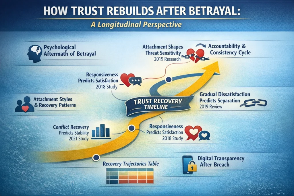 Yet not all relationships end after betrayal. Longitudinal research studies that follow couples over time suggests that recovery is possible under certain conditions. Trust rebuilding does not hinge on a single apology or emotional conversation. Instead, it unfolds gradually through consistent behavioral patterns, emotional responsiveness, and time.